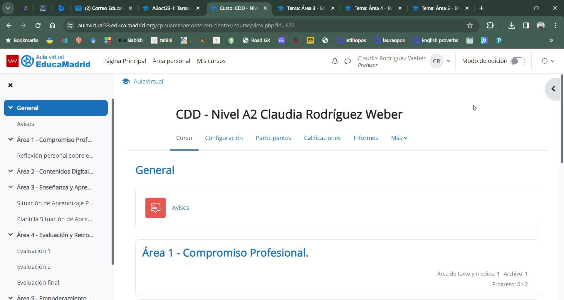 En mi curso, como podemos observar, están las diferentes áreas que si clicamos en la