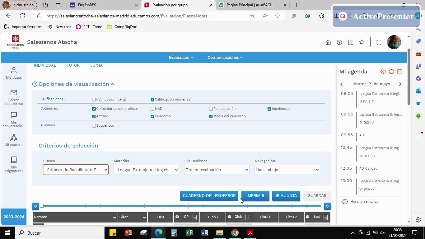 Para ello, también podemos ir por evaluación y crear nuestro cuaderno de notas desde un inicio. En este caso, si nos vamos a, por ejemplo, la clase de primero de bachillerato E, seleccionamos nuestra asignatura, aunque ahora nos encontramos en tercera evaluación, en la primera evaluación es muy recomendable.