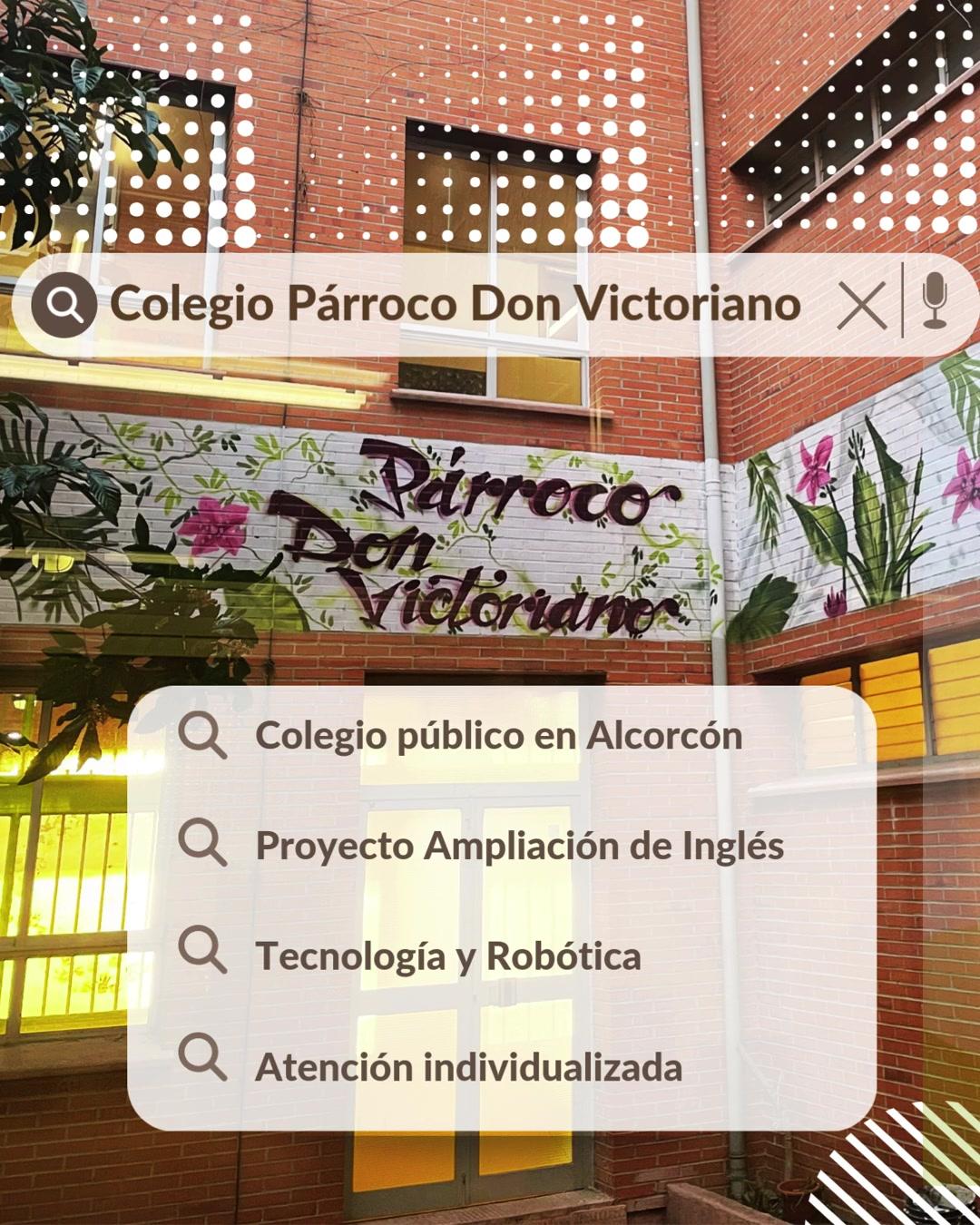 El Colegio Párroco Don Victoriano es un colegio público en Alcorcón con proyecto de ampliación de inglés, tecnología y robótica y atención individualizada.