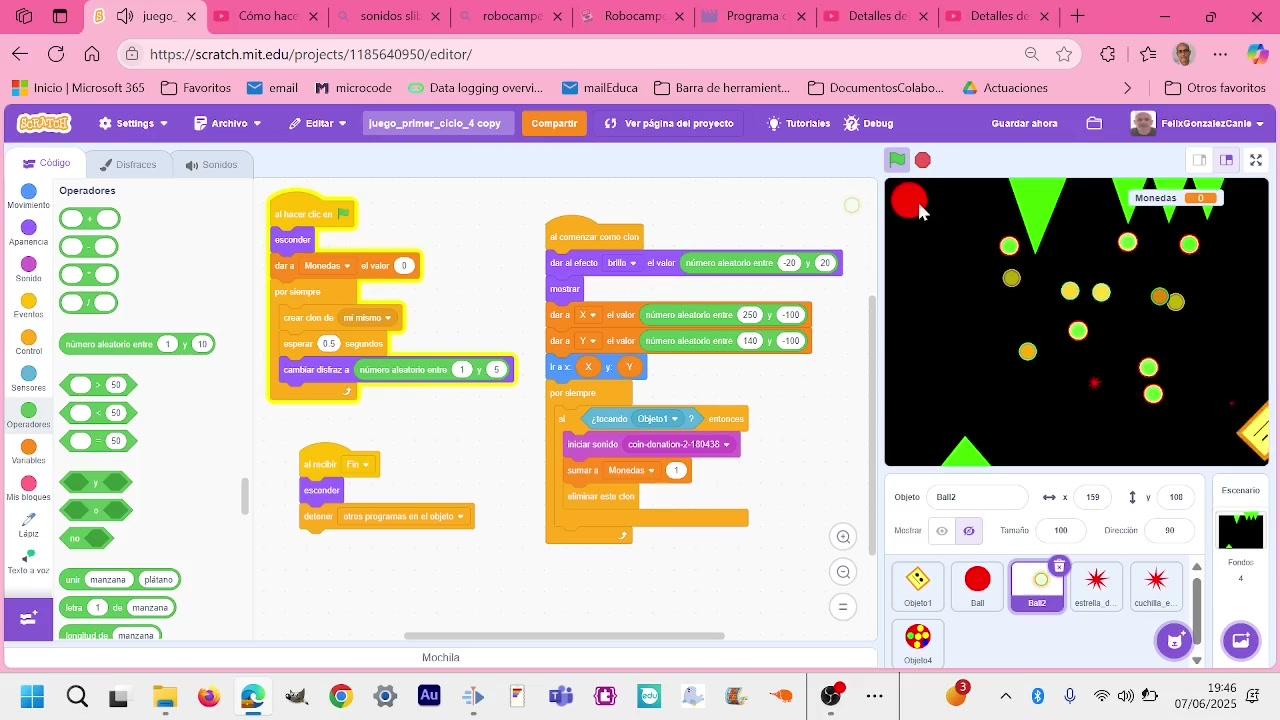 Programa crear clones para tener monedas en tu juego que recoger. Utiliza el efecto cambiar color, ir a posiciones concretas, puntúa y manda mensajes.