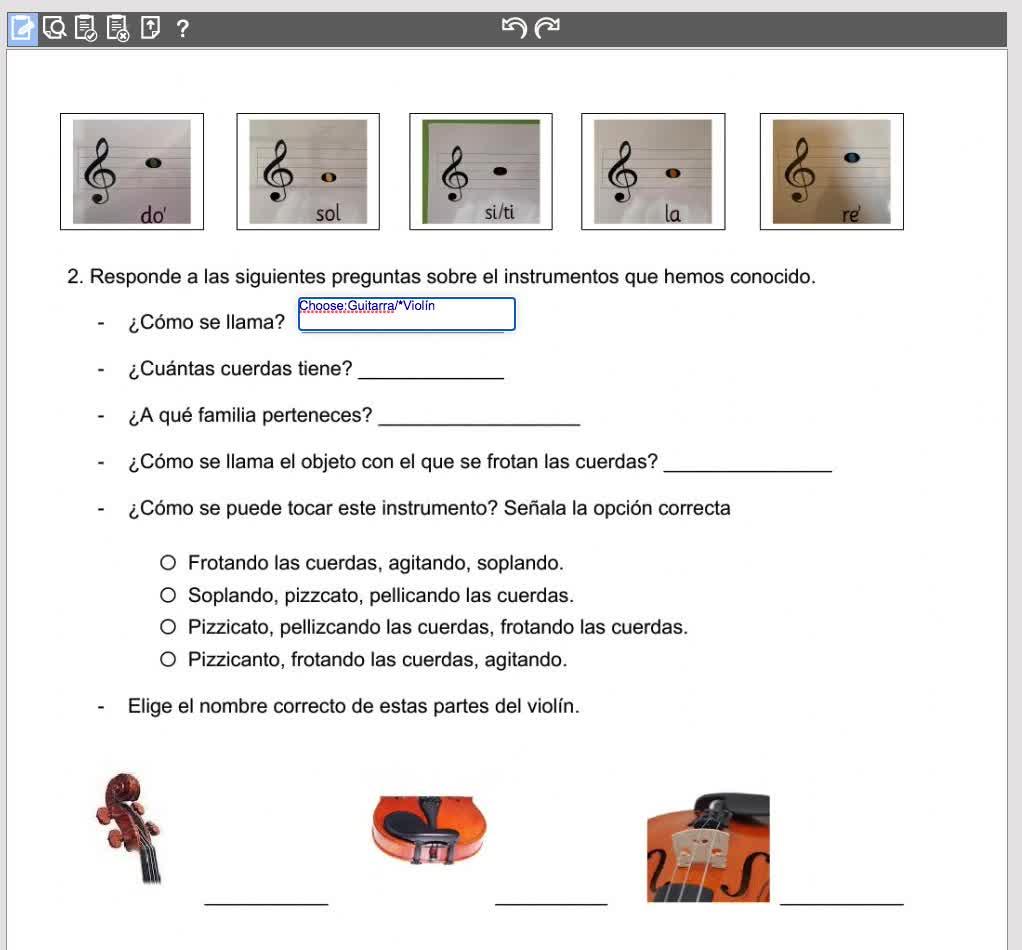 Por ejemplo, guitarra, que es opción incorrecta, violín, que es la opción correcta y por eso va con un asterisco, acordeón, que es opción incorrecta y violonchelo, que es opción incorrecta.