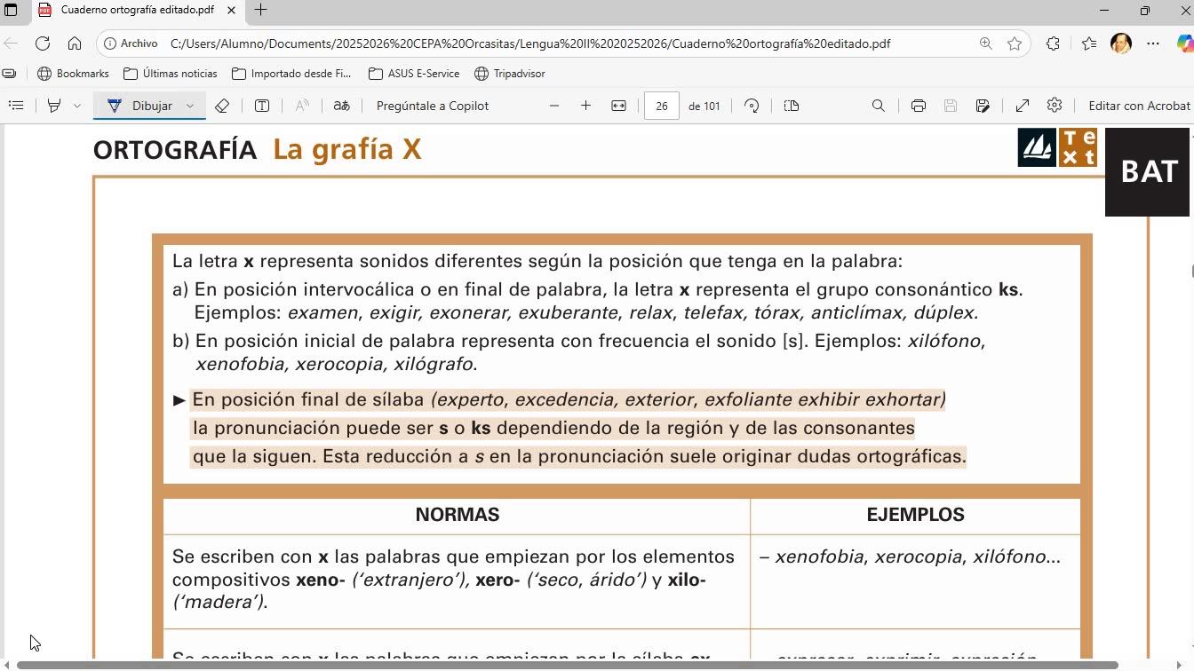 xilófono, xenofobia, xerocopia, xilógrafo, ¿vale? Entonces, es prácticamente parecido al sonido S, pero bueno, en el fondo habría que intentar decir KS cuando decimos una palabra que empieza por X, ¿vale?