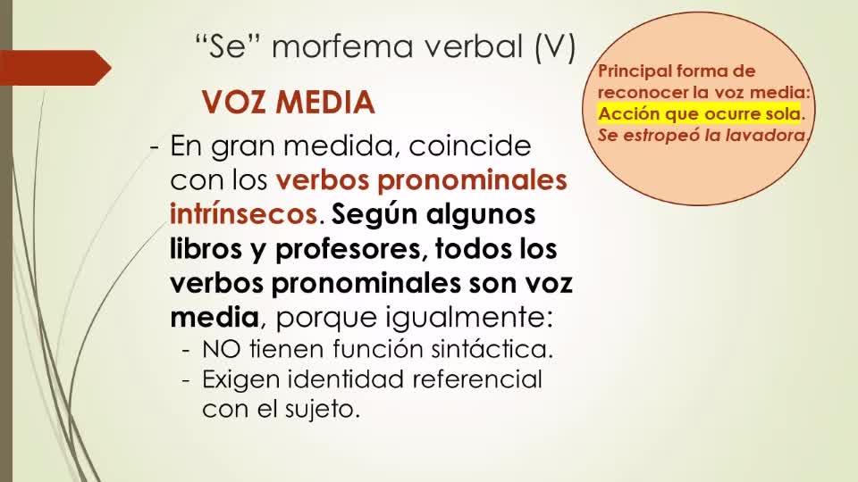 El siguiente caso que vamos a tener de se morfema verbal es la voz media. Hay que decir que esto es bastante difuso, la diferencia con los pronominales intrínsecos. En gran medida coincide con los pronominales intrínsecos.