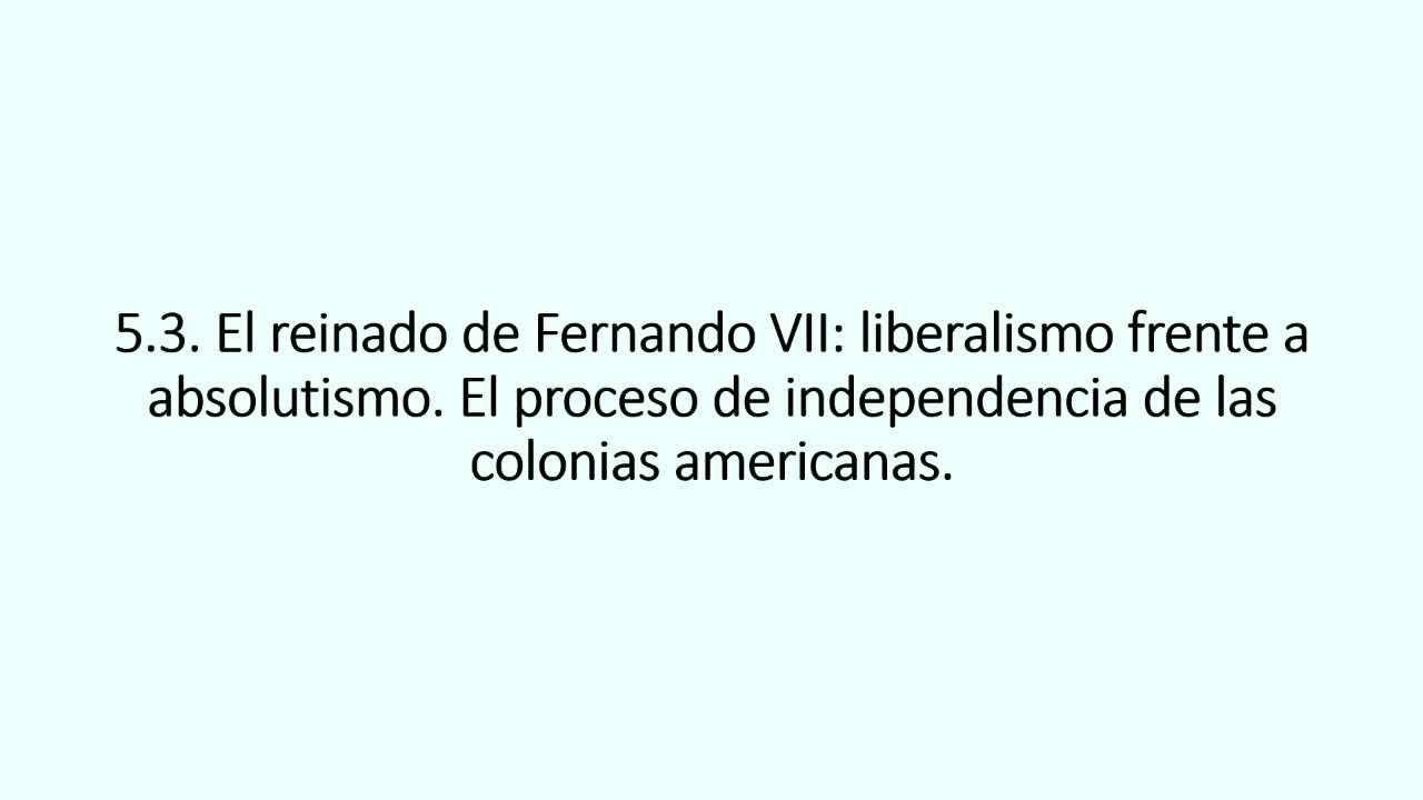 Vamos a comenzar con el 5.3. Como veis, en este 5.3 vamos a ver tanto el reinado de Fernando VII. Veréis que ese título de liberalismo frente a absolutismo no es casual. Vamos a ver precisamente cómo Fernando trata de imponer el absolutismo, de restaurarlo tras la guerra de la independencia y cómo lo logrará parcialmente.
