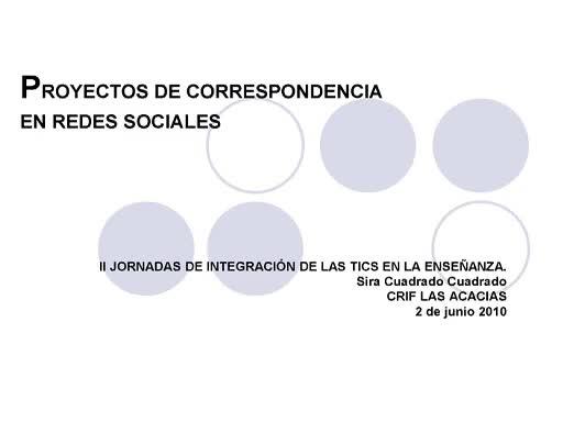 Ponencia Dª.Sira Cuadrado Cuadrado: "Proyectos de correspondencia en redes sociales" realizada en las II Jornadas de Integración de las TIC en las Enseñanza, el 2 de junio de 2010.