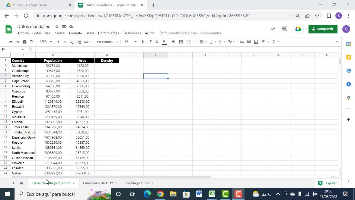 En la hoja de cálculo, datos mundiales, en la primera pestaña, densidad de población,