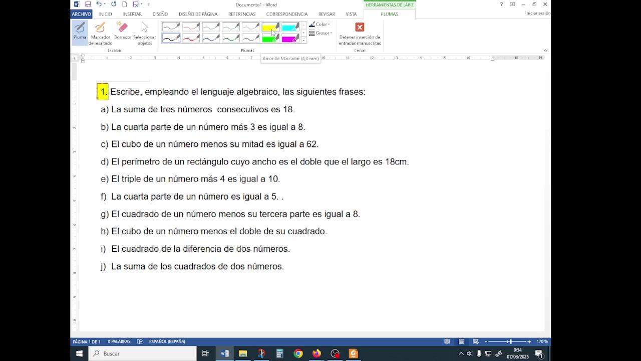 En este caso, por ejemplo, vamos a analizar determinadas frases y las vamos a traducir al lenguaje algebraico. Por ejemplo, vamos a hacer estas que voy marcando, no obstante, si tenéis alguna duda en algún ejercicio, pues lo comentáis.