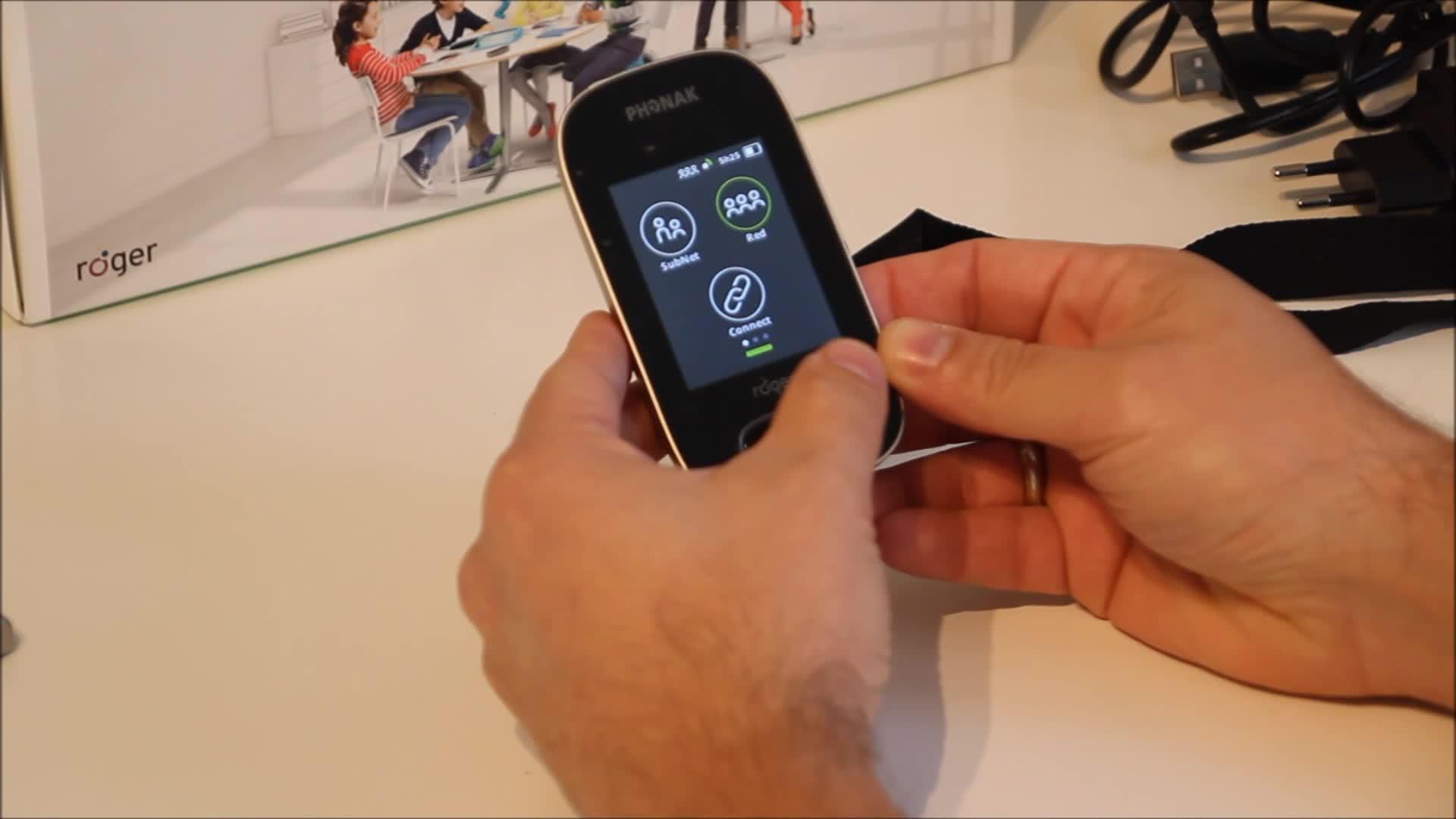 En este vídeo vamos a poner en marcha el equipo de micrófono remoto, este sería el emisor de la marca Phonak Roger Touchscreen.