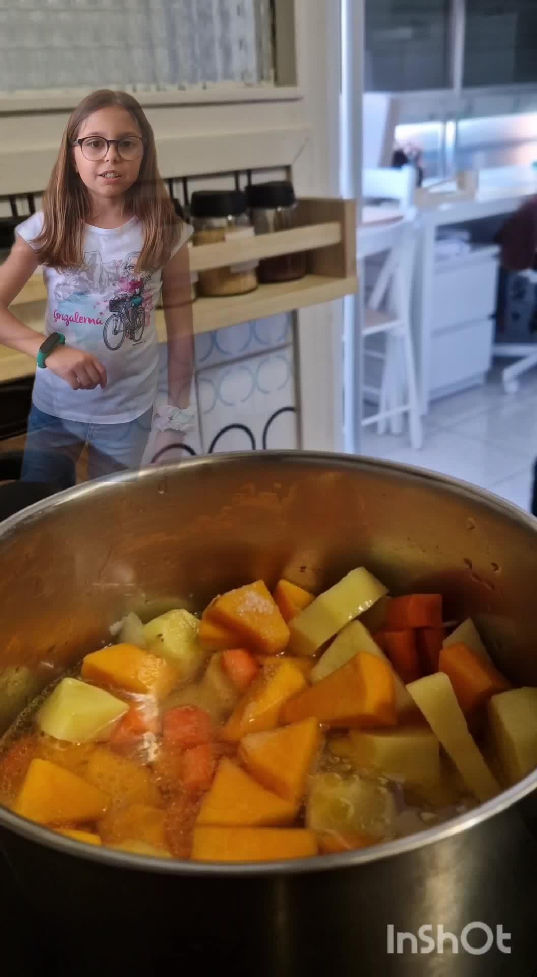 Then add the pumpkin, carrots and potatoes to the saucepan and mix everything.