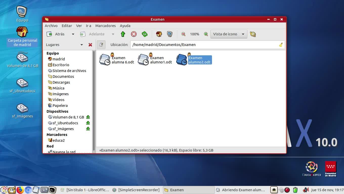 Vamos a la carpeta de exámenes y vemos que, además del examen del alumno 1, que podemos abrir, es un documento de libre office,