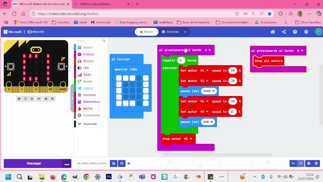 Hola, buenos días. Estamos programando con MakeCode la placa Microbit y lo que estamos haciendo, pues mira, tenemos dos motores, un coche.