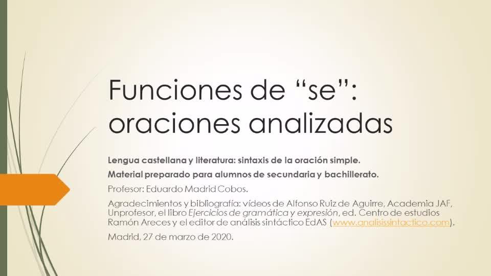 Las siguientes explicaciones tienen como objetivo afianzar los conceptos adquiridos en los vídeos anteriores de teoría de los usos o funciones de SE y demás pronombres personales átonos, mediante la presentación de una serie de oraciones analizadas ya resueltas.