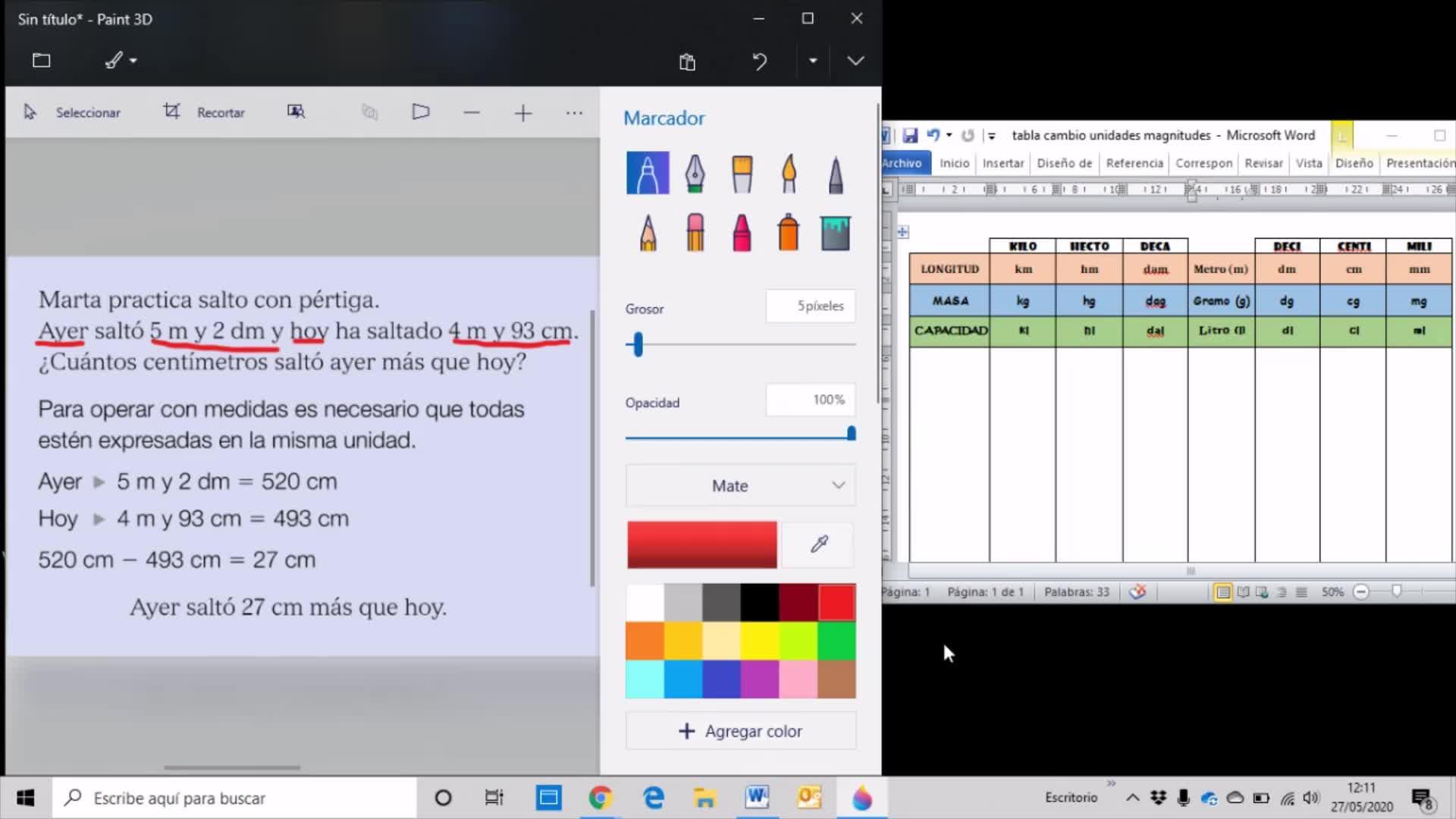 Por lo tanto, la respuesta a la pregunta, ¿cuántos centímetros saltó ayer más que hoy? Será, ayer saltó 27 centímetros más que hoy. ¿Vale? Veis que es fácil. Lo importante aquí siempre es que tengáis en cuenta que para calcular cualquier operación tengo que ponerlas todas en la misma unidad y que esa unidad tiene que ser la que me pida la pregunta, la que me pida el problema. ¿Vale?