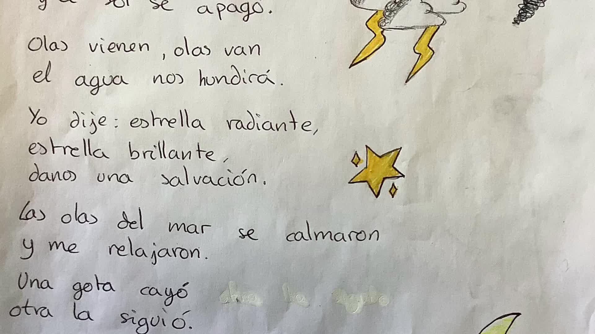 La naturaleza tiene vida, era una pluma muy ligera hasta que se cayó, el cielo se enfadó y el sol se apagó, olas vienen, olas van, el agua nos hundirá, yo dije, estrella radiante, estrella brillante, danos una salvación, las olas del mar se calmaron y me relajaron, una gota cayó, otra la siguió, llora cristalina, agua brillante, cada vez que la miras te ilumina como una luna menguante,