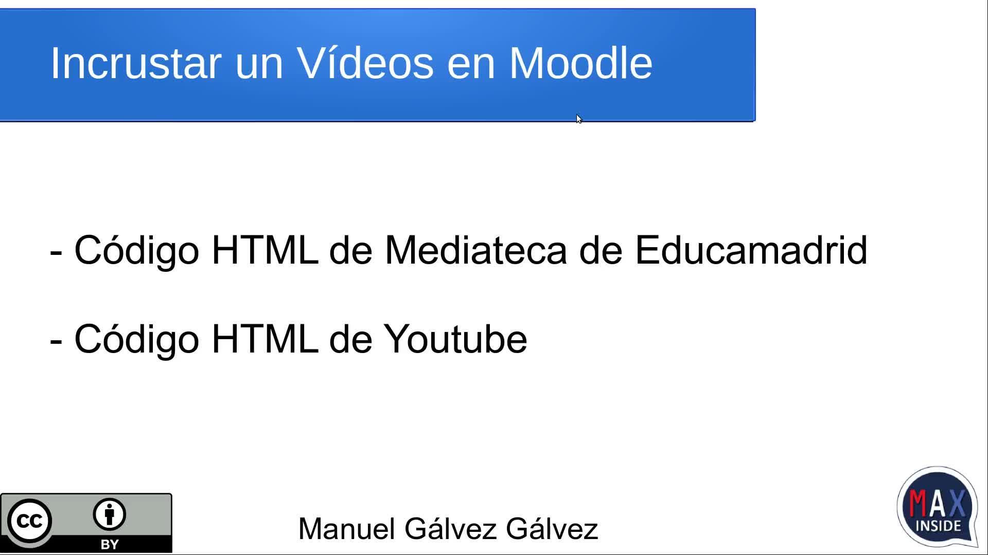 Para trabajar en el aula virtual de educamadrid (moodle), un recurso habitual es la publicación de contenidos en vídeo. En este vídeo tutorial se muestra la forma de incrustar vídeos en html. Esta forma también sirve para publicar contenidos en webs de educamadrid.