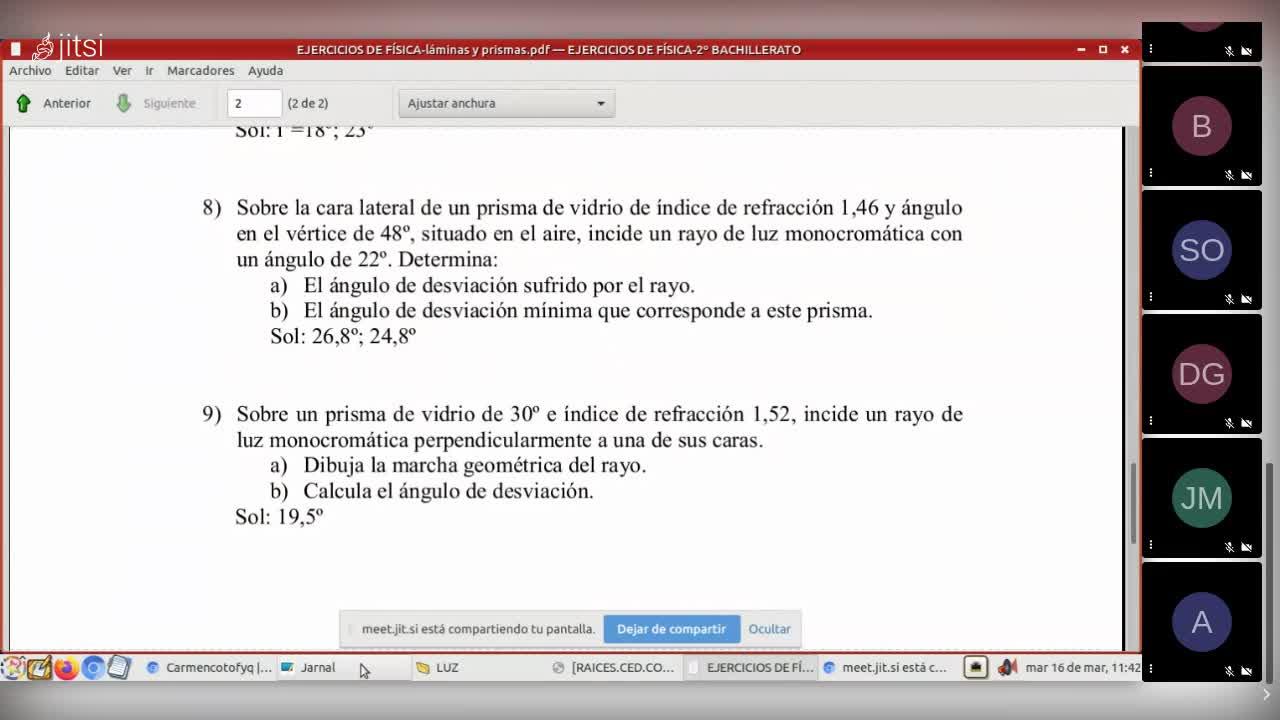 Sí, venga, a ver, entonces, vamos a empezar con el ejercicio 8. A ver, en el ejercicio 8 nos dice, vamos a ver lo que nos ha denunciado, dice sobre la cara lateral de un prisma de vidrio de índice de refracción 1,46 y ángulo en el vértice 48 grados situado en el aire, incide un rayo de luz monocromática con un ángulo de 22 grados.