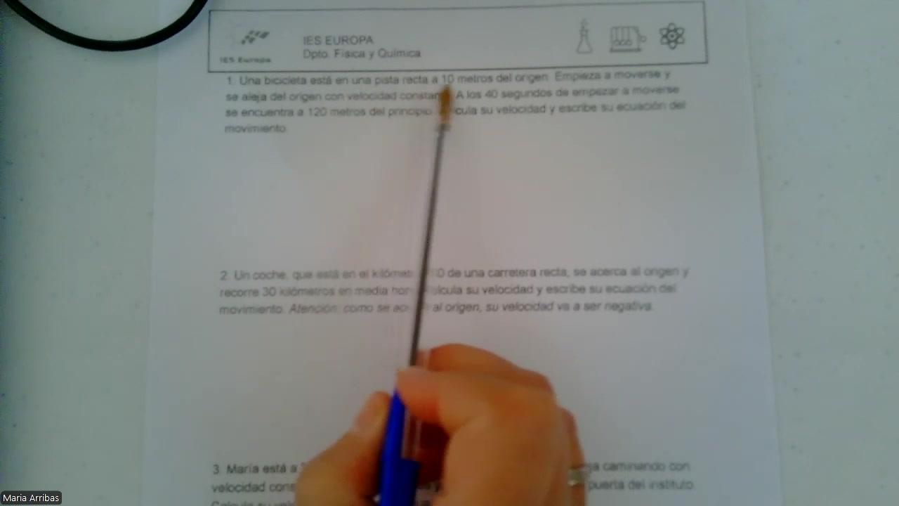 A ver, mira, Mara, por ejemplo, el primer problema, ¿vale? Me dije, una bicicleta está en una pista recta a 10 metros del origen. O sea, si aquí está el origen, la bicicleta está aquí a 10 metros, ¿vale? Y empieza a moverse y se aleja del origen con una velocidad constante.