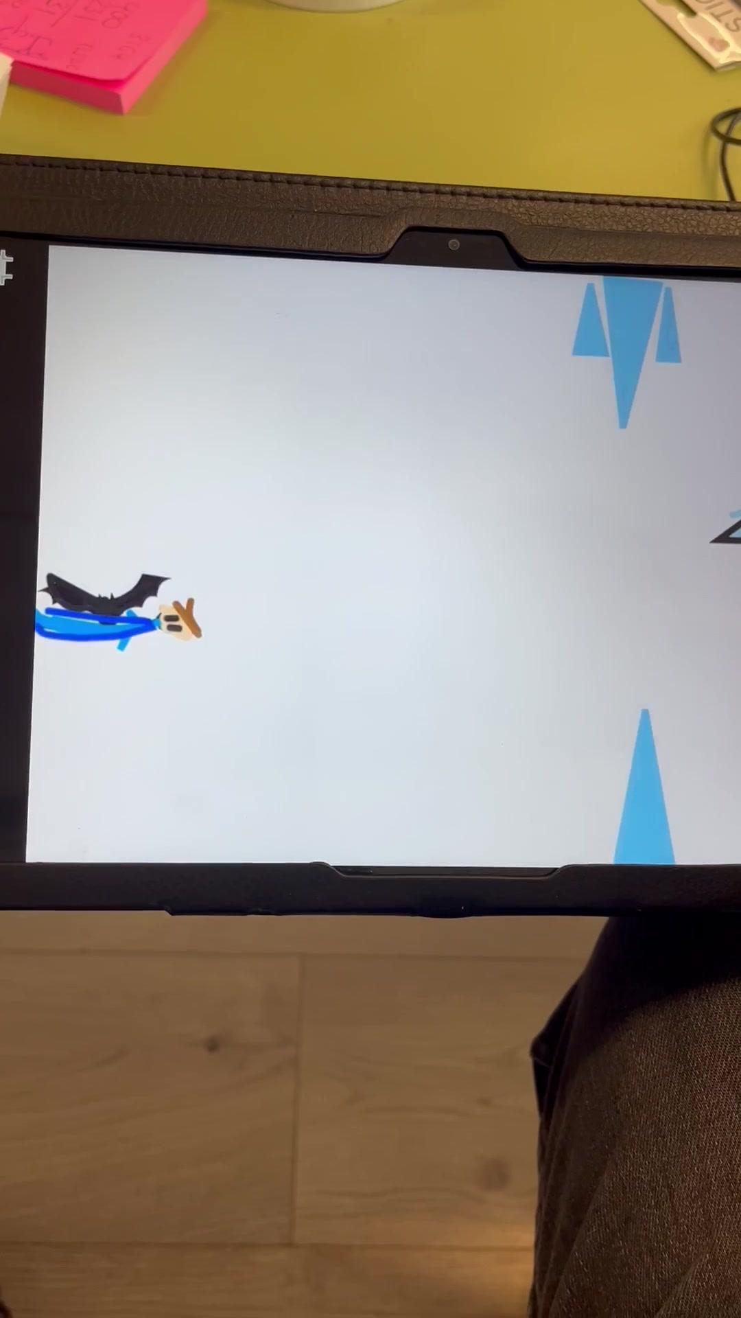 Utiliza los bloques de mandar mensaje y al pulsar para hacer un botón que permita a tu personaje volar. Usa el bloque azul para que tu personaje caiga.