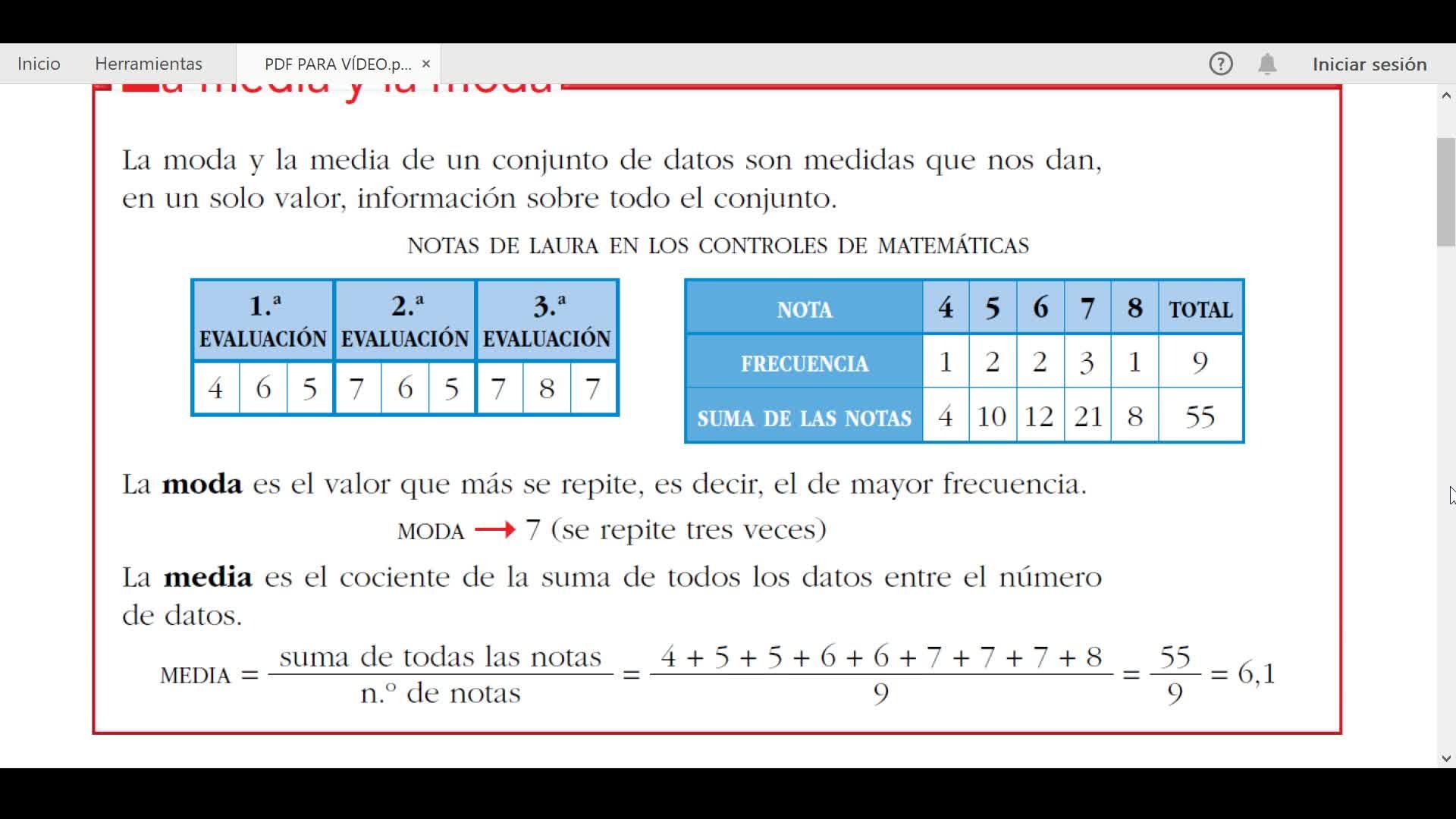 ¿Cuál ha sido el dato que más se repite? El 7. Es decir, esa nota que más se ha repetido a lo largo del curso de Laura ha sido un 7.