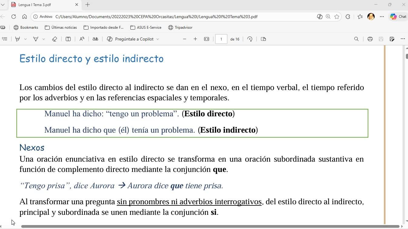 En esta sesión lo que voy a contar es que es esto de estilo directo y estilo indirecto que está en los apuntes de lengua nivel 1 que nos habíamos saltado porque lo que vimos fue lo que venía en las páginas de la página 4 en adelante.
