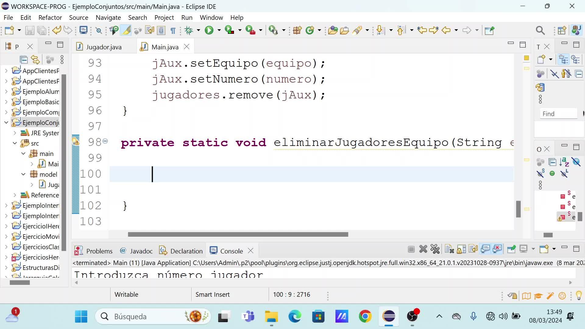 Vale, aquí no se puede plantear hacer la revuelta, la situación es distinta, porque puede haber varios, aquí no hay igualdad por equipo, la igualdad es por equipo y número, entonces aquí pues uno, ¿qué le podrías ir a hacer? Pues un forno, uno para localizar, para cada jugador, jota en jugadores, vamos a ver si este es uno de los que toca borrar, si este es uno de los que toca borrar,