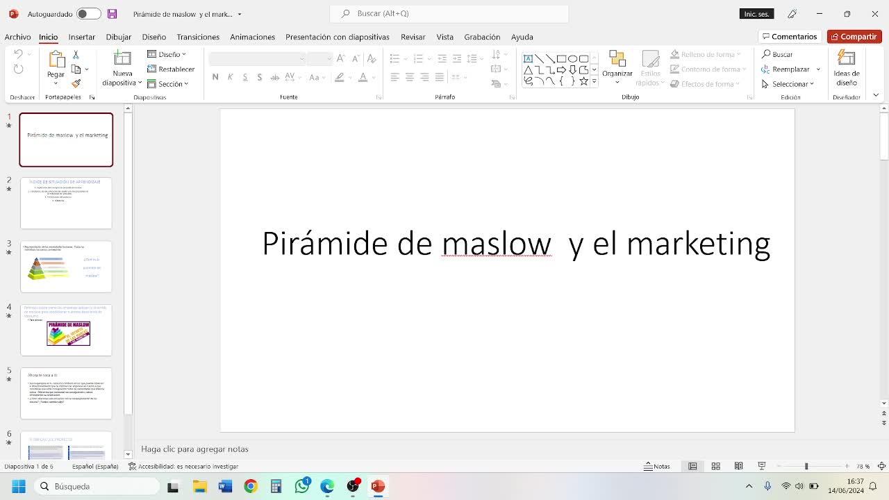 Bueno, yo he preparado un PowerPoint sobre la pirámide de Maslow y el marketing, un índice de una situación de aprendizaje, vamos a explicar qué es el concepto de la pirámide de Maslow,