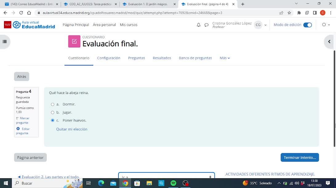 Consta de cuatro preguntas. Pregunta 1, ¿dónde viven las abejas?