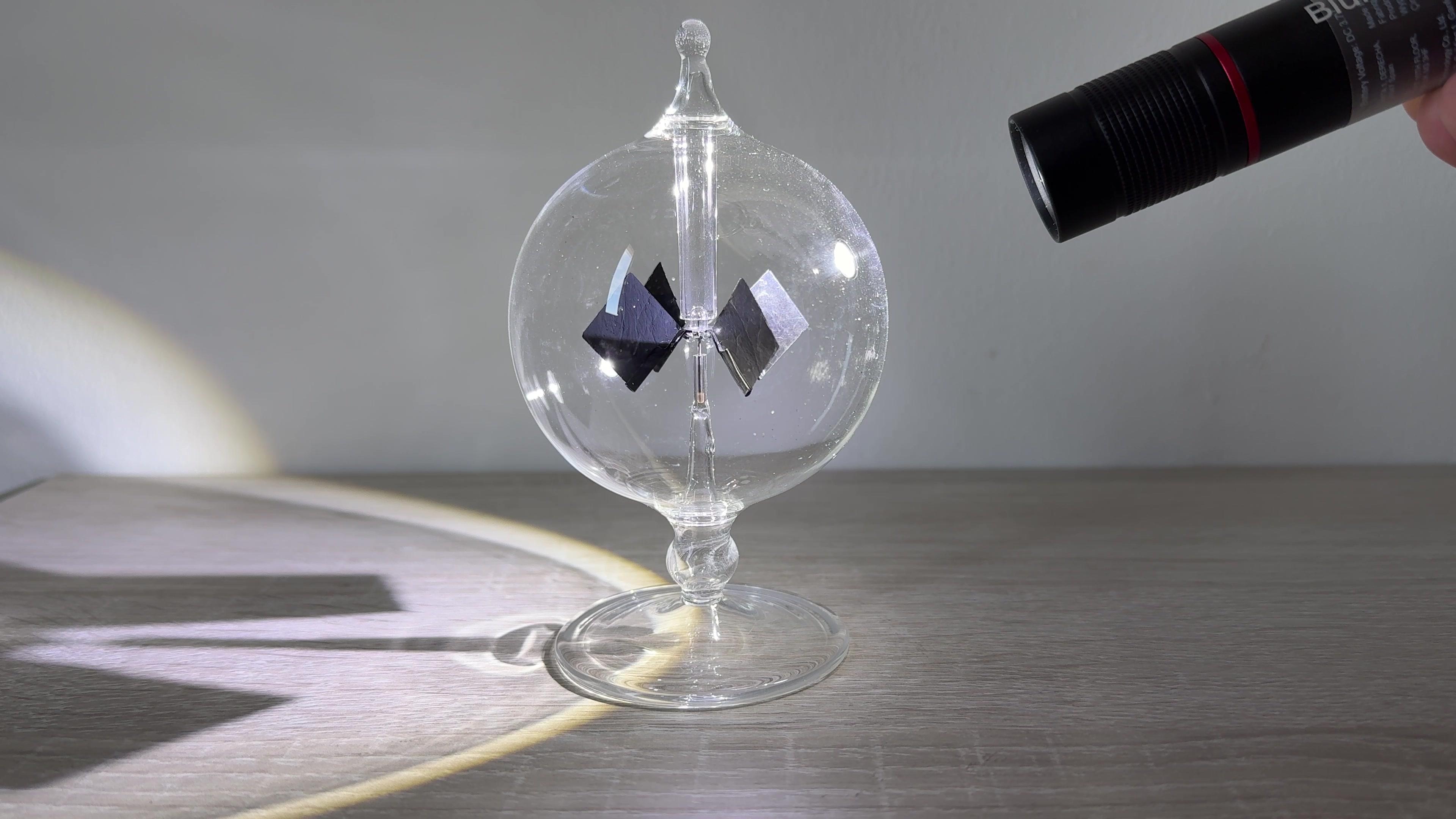 Experiencia de cátedra que ilustra la conversión de energía radiante en energía cinética de rotación en un radiómetro de Crookes.