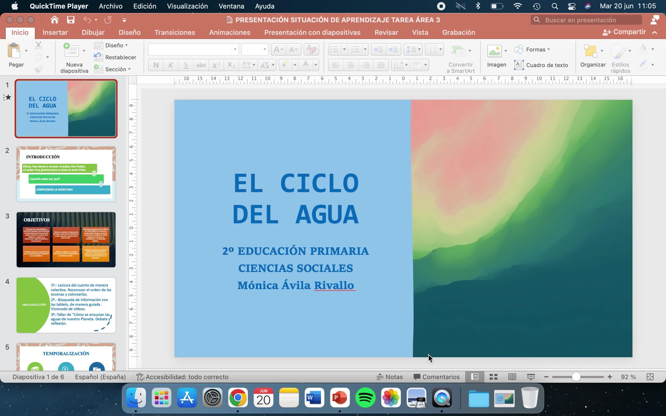 Como podemos observar, tiene como título el ciclo del agua y está realizada para el nivel de segundo de primaria.