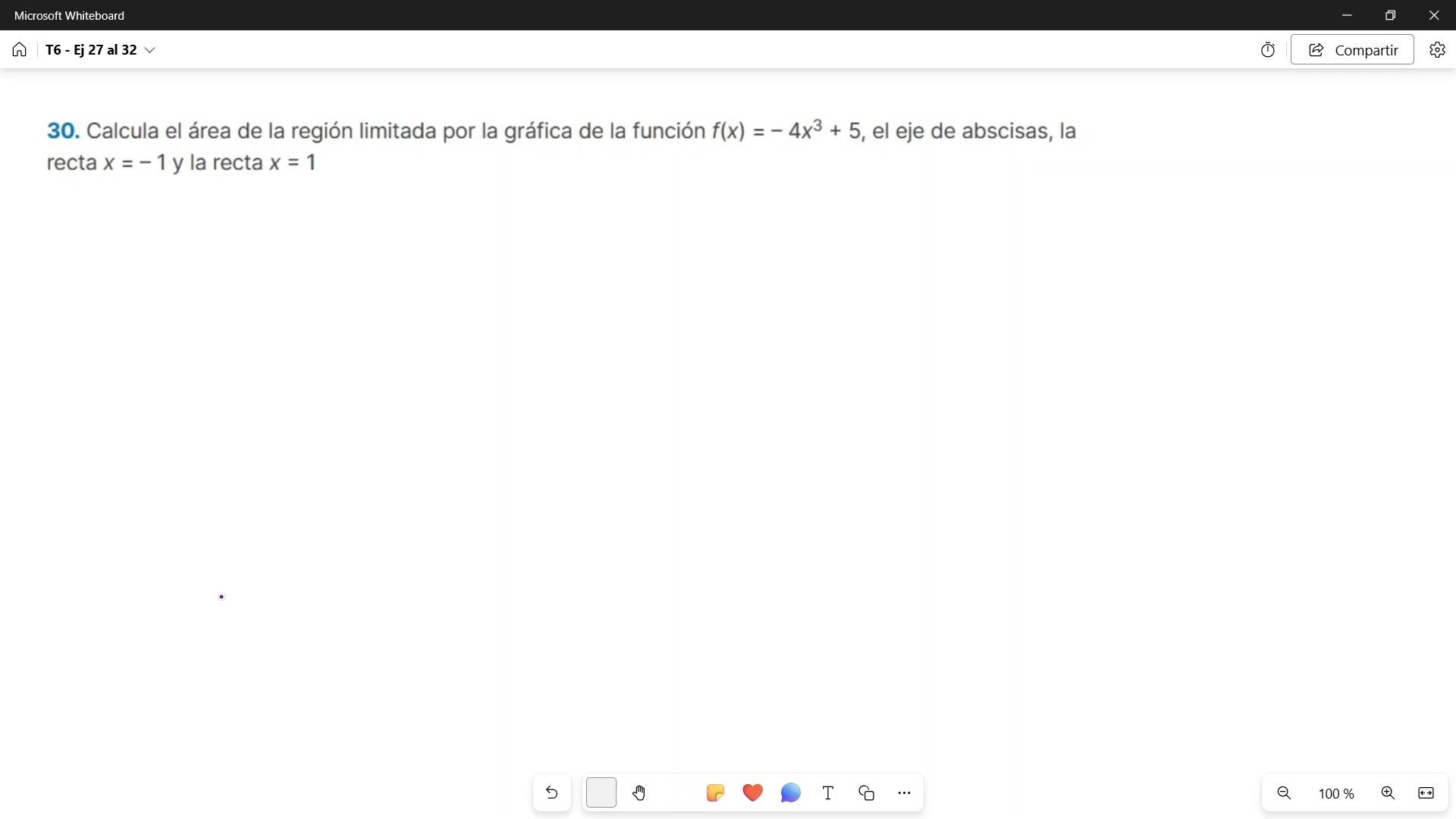 Vamos con el ejercicio 30. Me piden calcular el área de la región limitada por la gráfica, que es una cúbica, el eje de abscisas y la recta es x igual a menos 1 y la recta x igual a 1.
