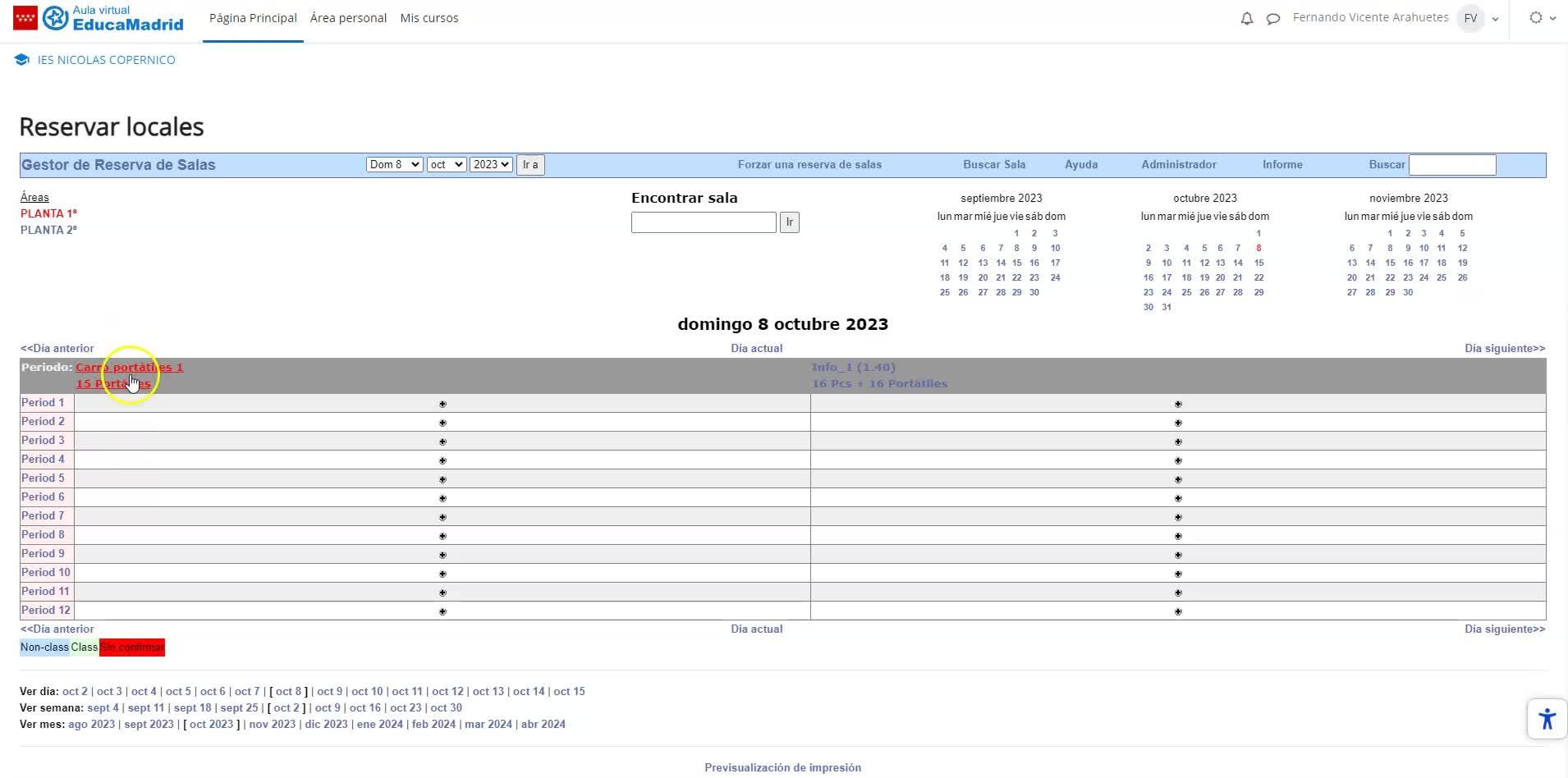 O sea, se están reservadas para impartir clase por el departamento de tecnología. Las que queden libres son las que podemos reservar. Estos son los periodos lectivos. Hasta el 7 es el nuevo nuestro. El carrero portátil está libre todos los días. Básicamente siempre va a estar libre. Y en este caso tengo cuatro horas libres.