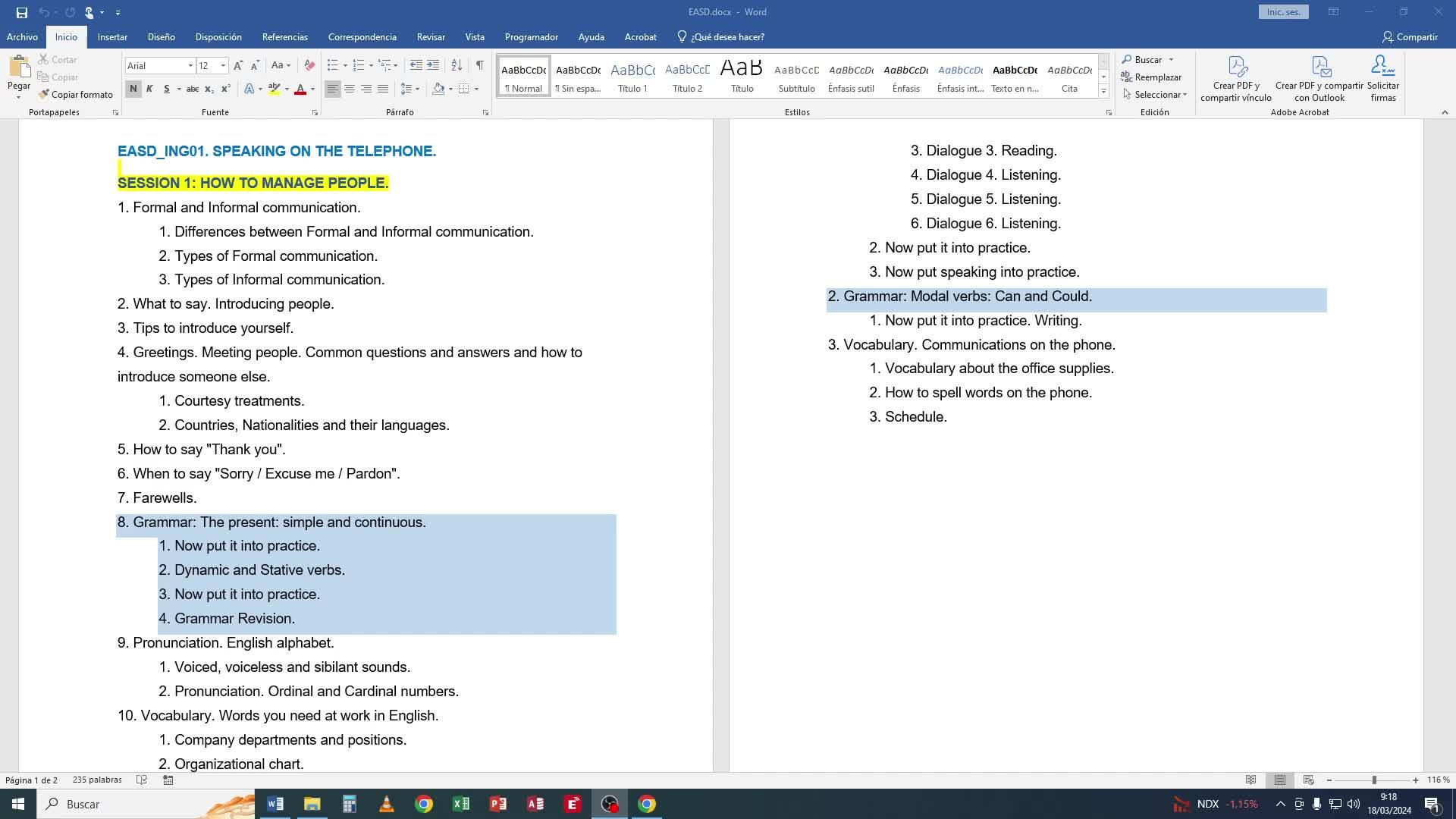 Vale. En cuanto a gramática, en la primera sesión tenemos el presente simple y el presente continuo, los verbos estáticos y dinámicos, y tenemos también los modal verbs can y could.