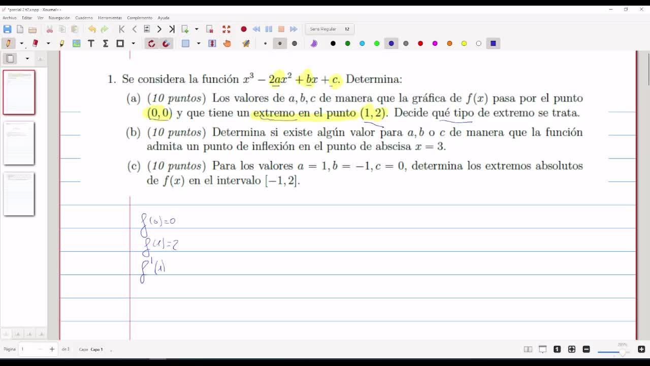 En el apartado b nos dicen que tenemos que determinar a, b y c para que en el punto x igual a 3 haya un punto de inflexión.