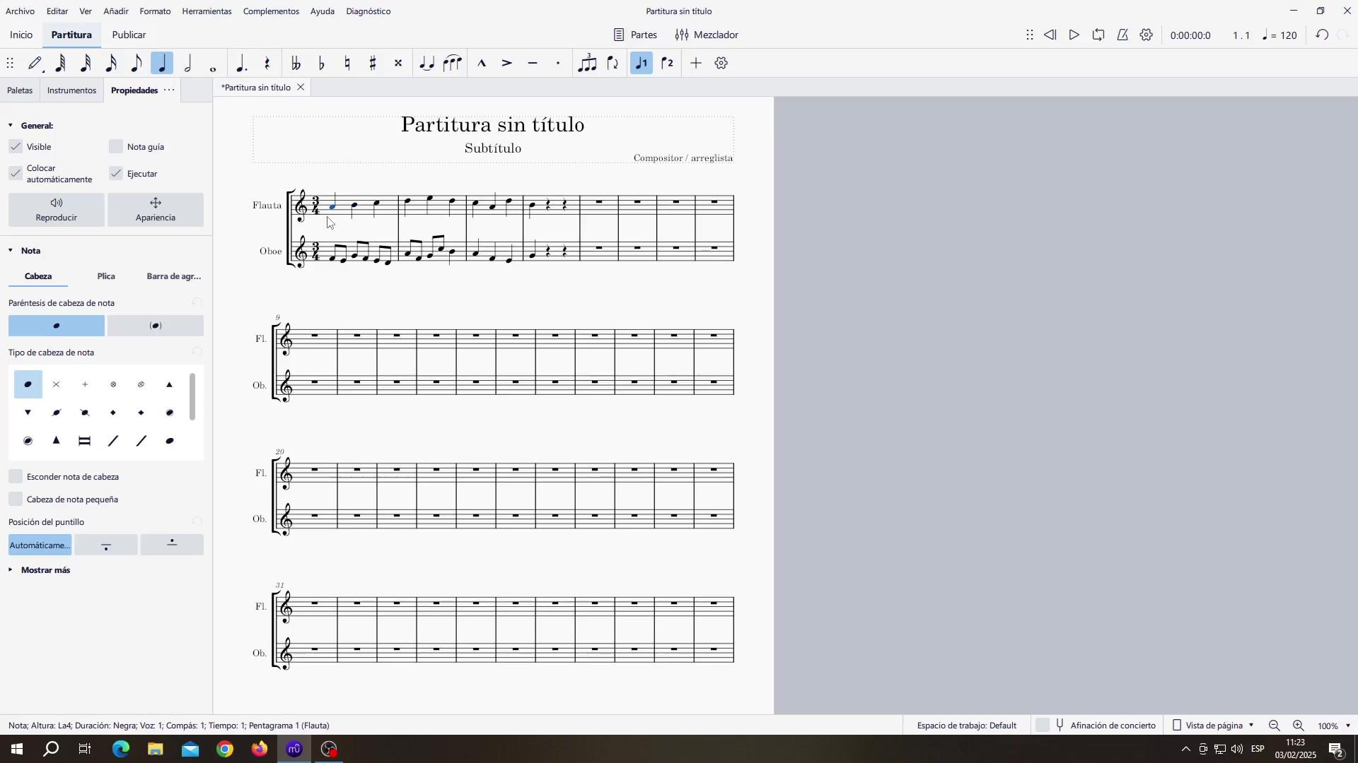 Para dejar un espacio al inicio de la partitura que estamos trabajando con ella, lo primero que haremos será seleccionar la primera nota, ya sea en el pentagrama de arriba o en el de abajo, ese es diferente.