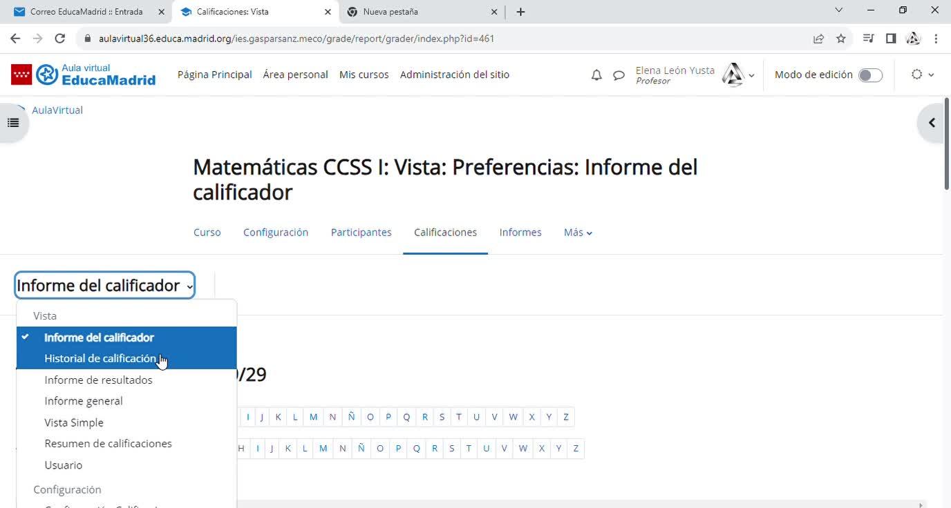 Entonces, tenemos que irnos al curso, al que queramos, pues yo este por ejemplo, y nos vamos a calificaciones.