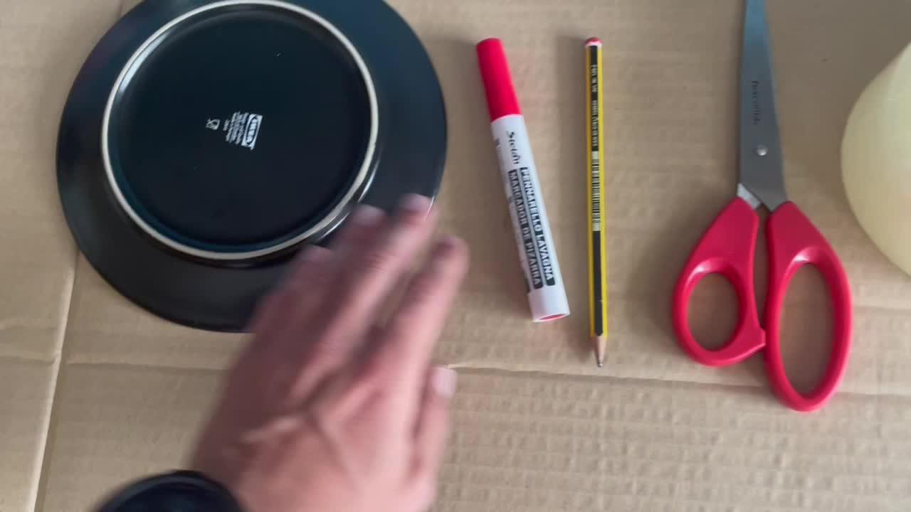 un plato, un rotulador o un lápiz, unas tijeras, cinta adhesiva o celo,