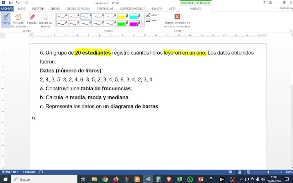 Vamos a resolver el ejercicio número 5. En este caso, en vez de darnos la tabla de frecuencia, nos aparecen los datos. Nos dice que hay un grupo de 20 estudiantes en el que se analizan cuántos libros leyeron en un año.