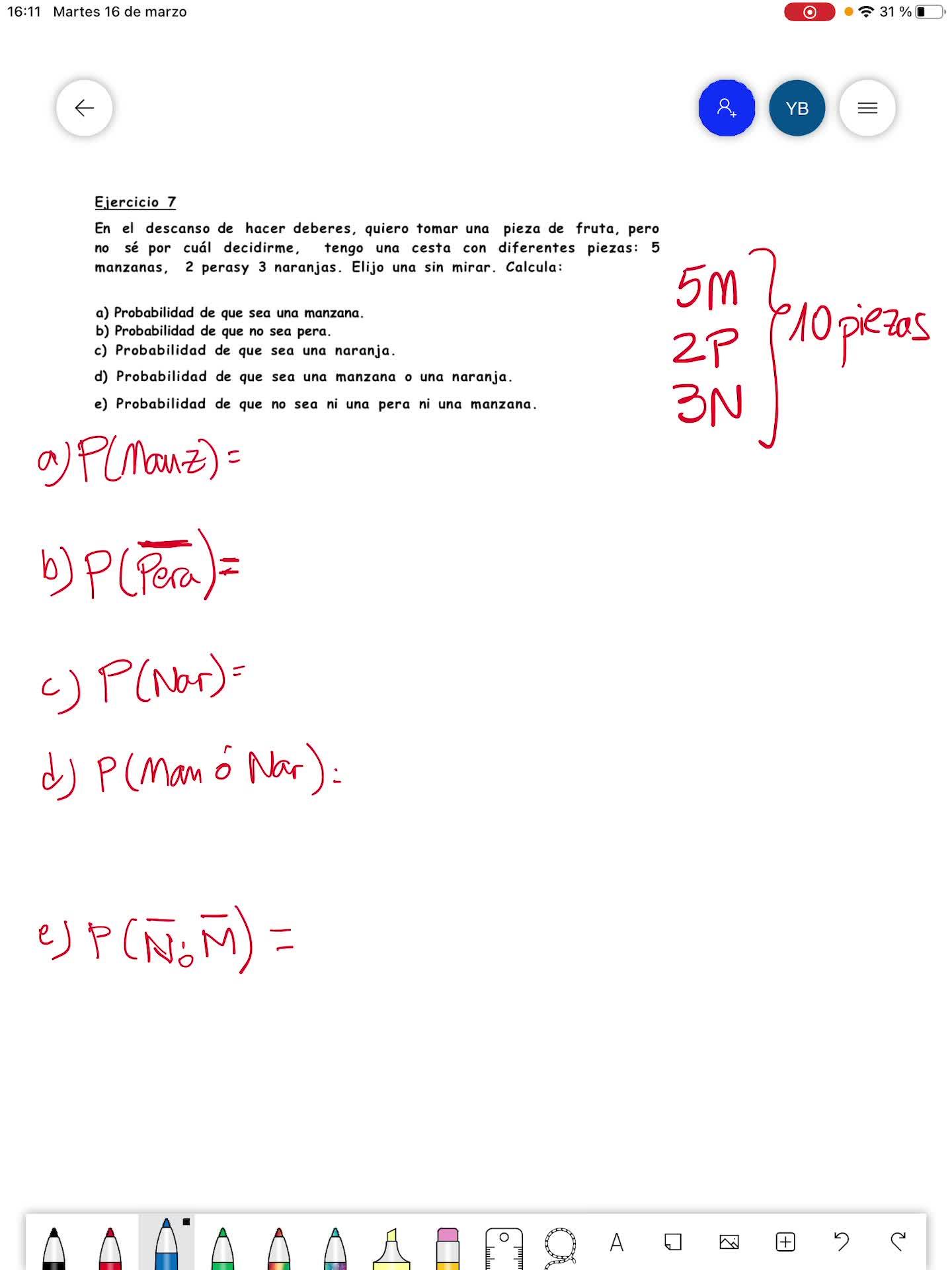Pues es que de 10 frutas, saco una fruta, es decir, cualquiera de las piezas me vale, menos la probabilidad de sacar naranja o manzana, es decir, 10, esto sabemos que es una suma,