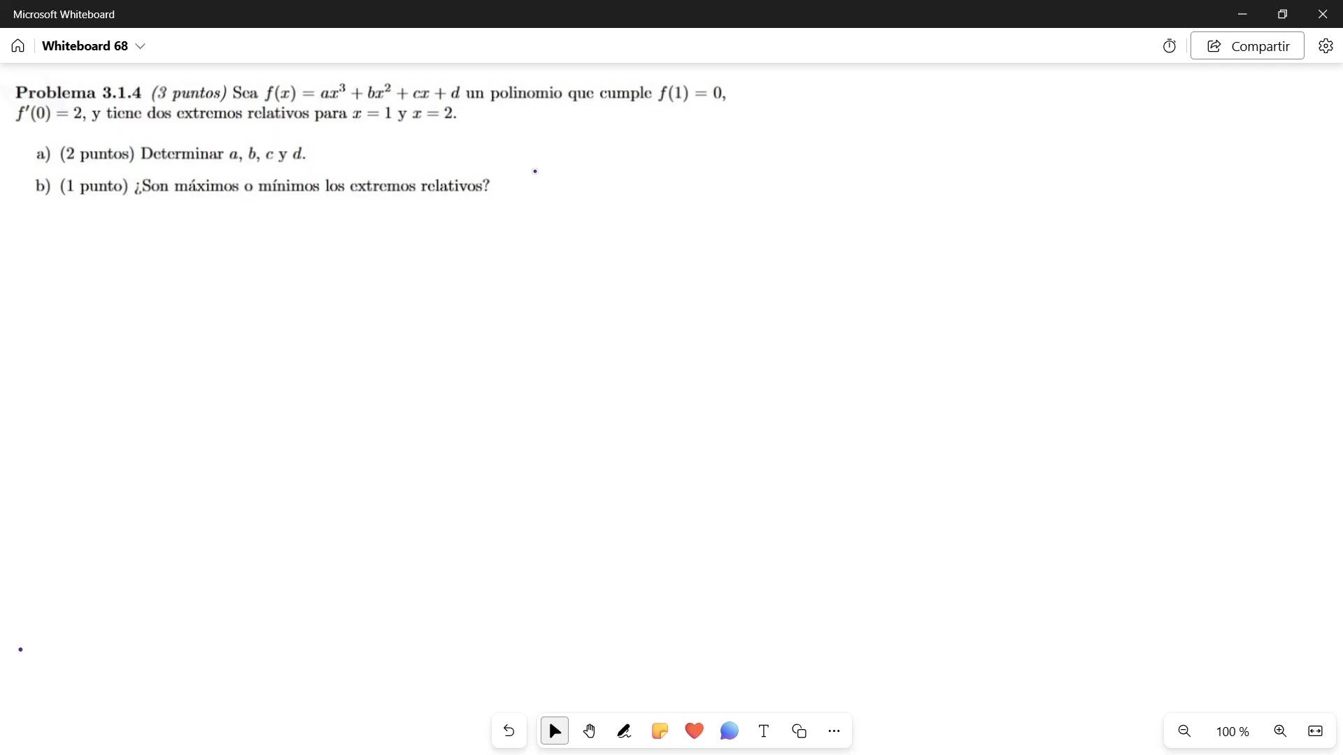Vamos a ver este ejercicio. Nos dicen sea f de x igual a x cubo más bx cuadrado más cx más d, un polinomio que cumple f de 1 igual 0, f prima de 0 igual 2 y tiene dos extremos relativos para x igual 1 y x igual 2.