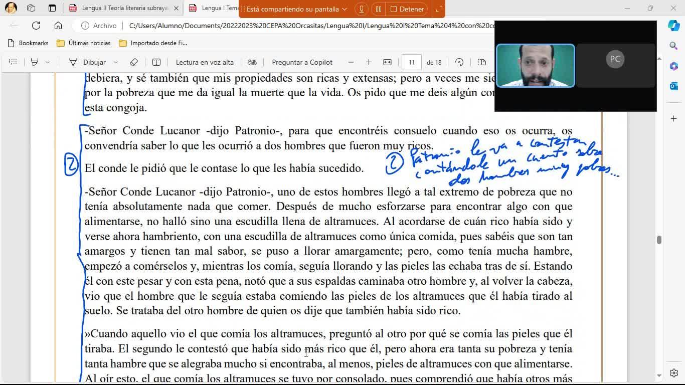 Es la parte en la que Patronio, su consejero, su tutor, le contesta con un cuento que en este caso era sobre dos hombres que habían sido muy ricos y estaban muy pobres y uno iba comiendo altramuces y el otro iba comiendo las cáscaras que iba tirando, ¿vale?