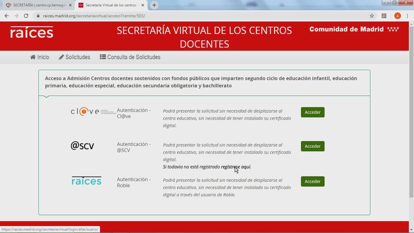 Una vez ya estamos registrados, clicamos en acceder o en clave, en SCV o en raíces, en mi caso en raíces.