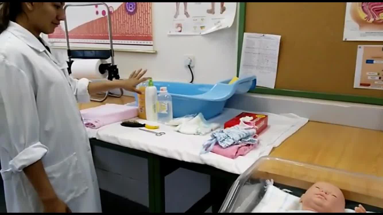 Práctica baño del bebé, materiales, bañera de bebé, jabón neutro, esponja suave, cambiador, toalla algodón, gasas, suero fisiológico, crema hidratante, pañal, ropa de bebé, peine, guantes, tijera punta ronda.
