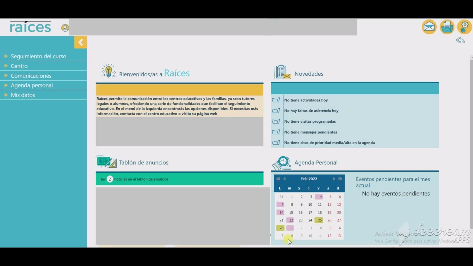 esta pantalla con diferentes posibles avisos que pueden variar en función del centro educativo,