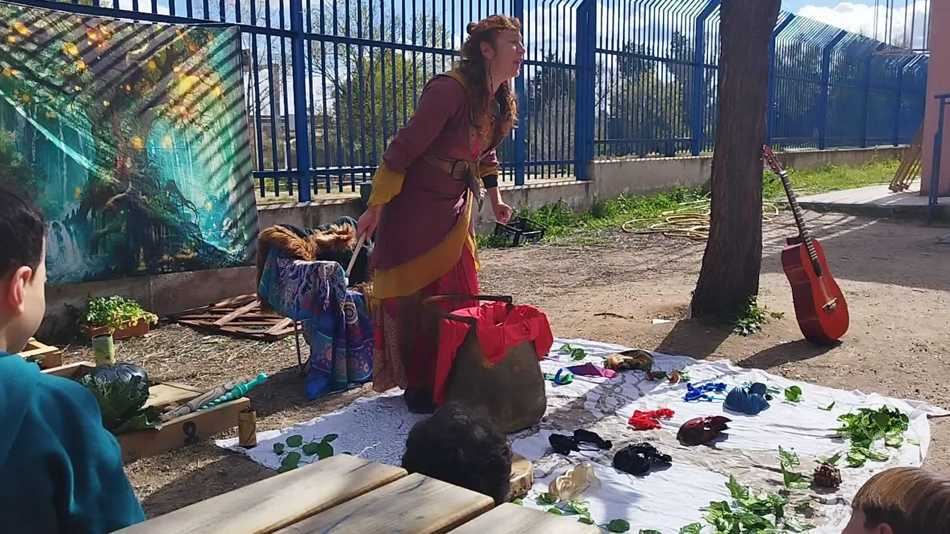 Dice, caldero mágico, dan el cuento, mueve las caderas, golpea el suelo.