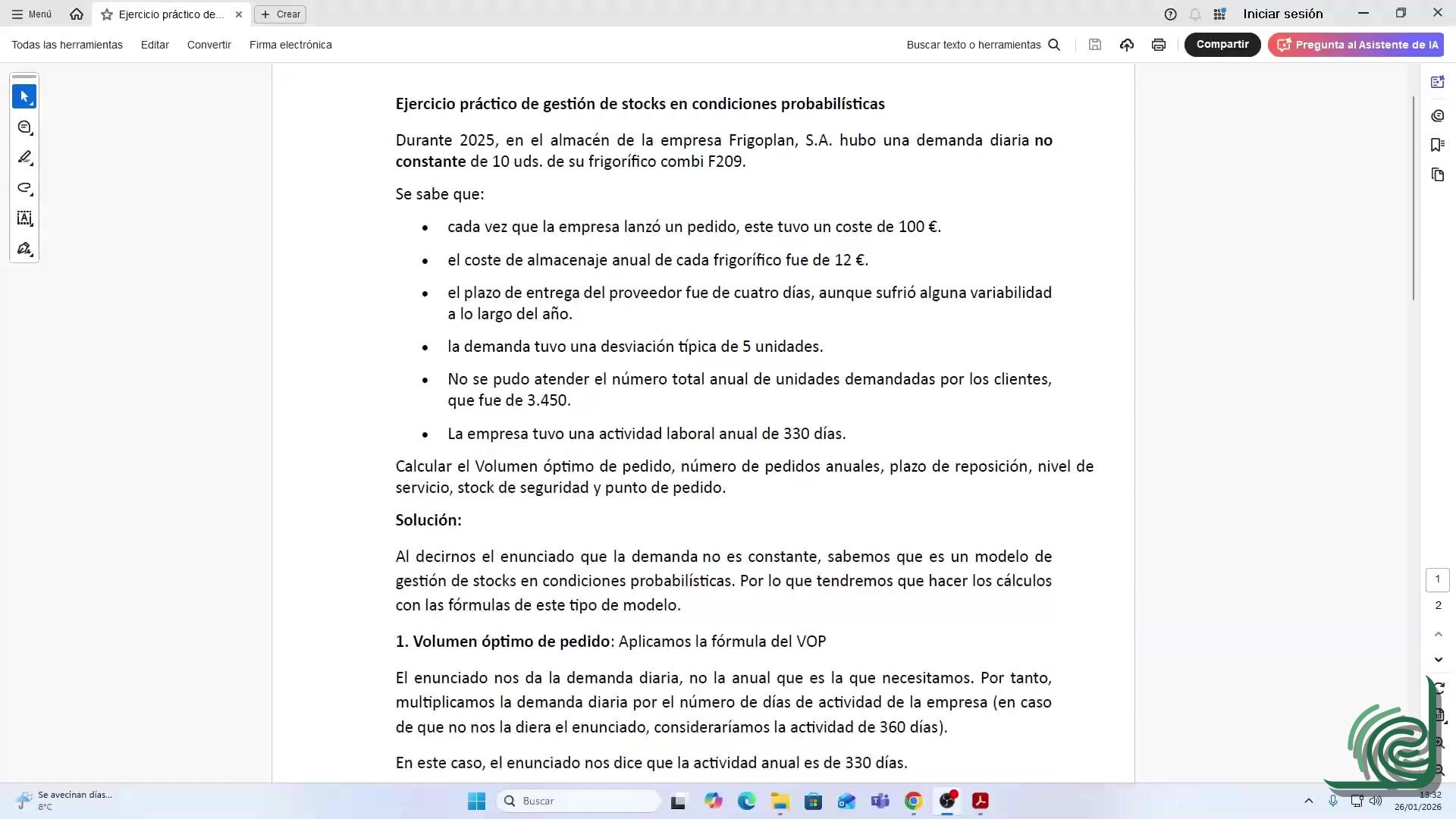 Bueno, por último vamos a hacer un ejercicio práctico de gestión de stocks en condiciones probabilísticas, para cerrar un poco ya todo este procedimiento de los modelos.