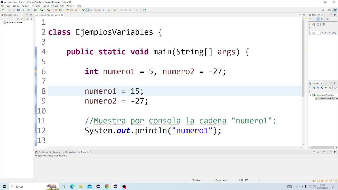 Bueno, pues eso estábamos, ¿verdad?, estábamos poniendo ejemplos sencillos, porque ahora mismo es todo muy sencillo lo que podemos hacer a nivel de código Java, es muy sencillo lo que podemos hacer, y eso estábamos viendo, ejemplos de declaración de variables, por ejemplo, enteras, recordad que vimos los 7, 4, 5, 6, 7, 8, 8, ¿verdad?, 4 enteros, 2 de decimales, 1 char y 1 boolean, 8,