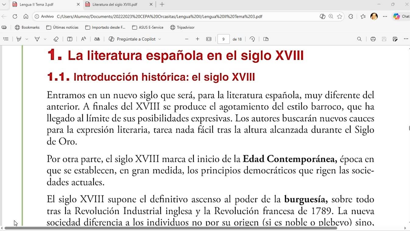 Bien, entonces, lo que teníamos aquí es lo siguiente. A partir de la página 7 de los apuntes, tenemos literatura del siglo XVIII.