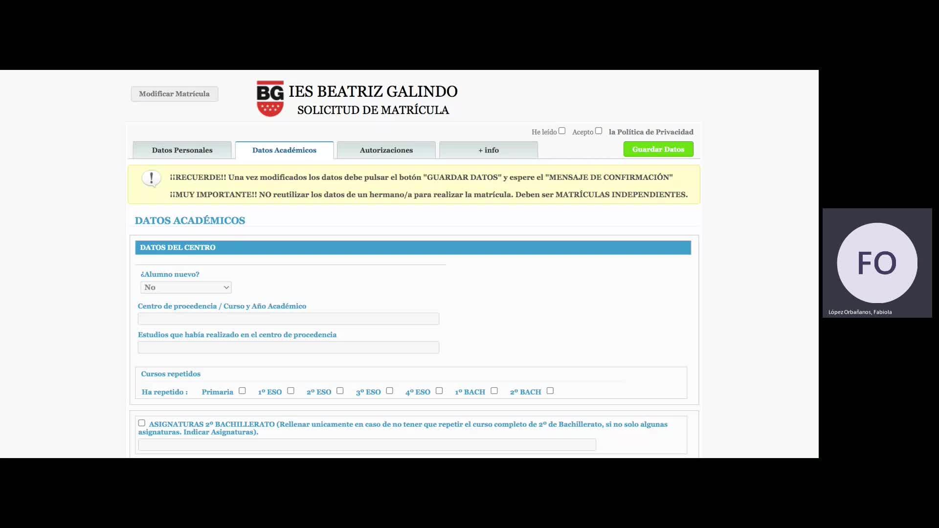 Cuando abrimos el formulario nos encontramos con cuatro pestañas, datos personales, datos académicos, autorizaciones y más info.