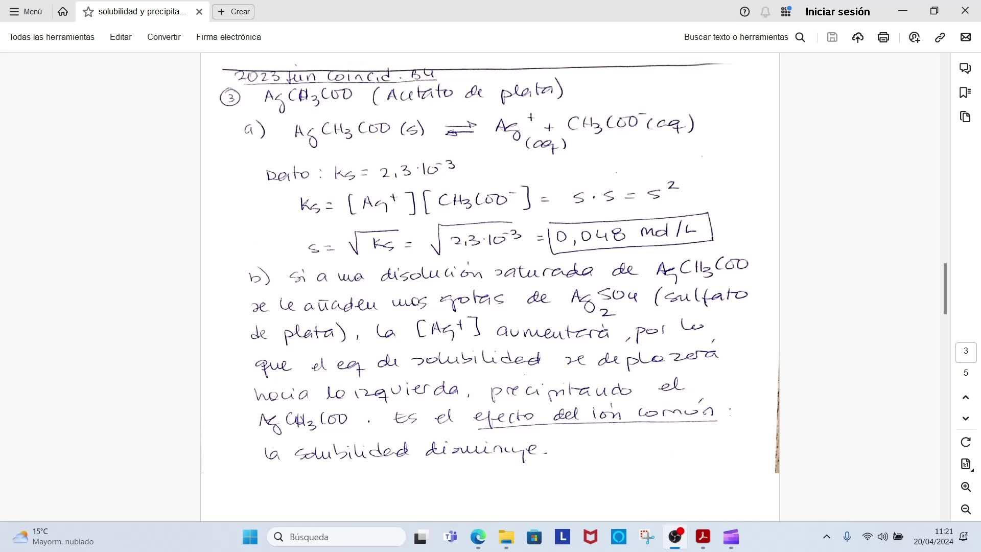 Bien, dice que para la sal acetato de plata, que es AGCH3COH, en primer lugar formule el equilibrio de solubilidad