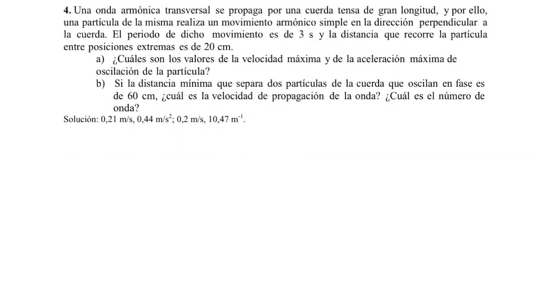 Bien, en cuanto al apartado B, me dice que si la distancia mínima que separa dos partículas de la cuerda que oscilan en fase son 70 centímetros, ¿cuál es la velocidad de propagación y el número de onda? Muy sencillo.